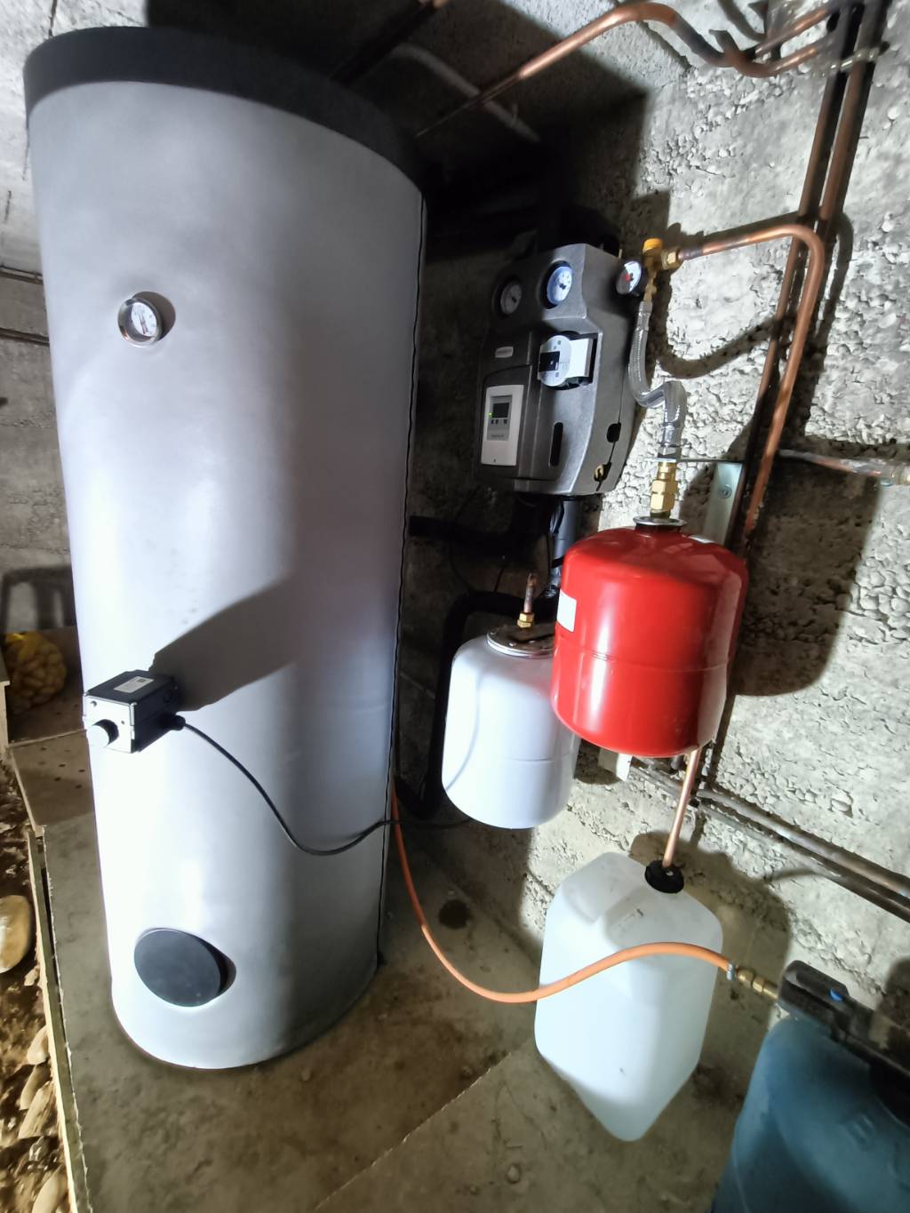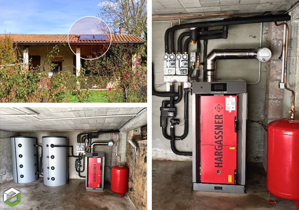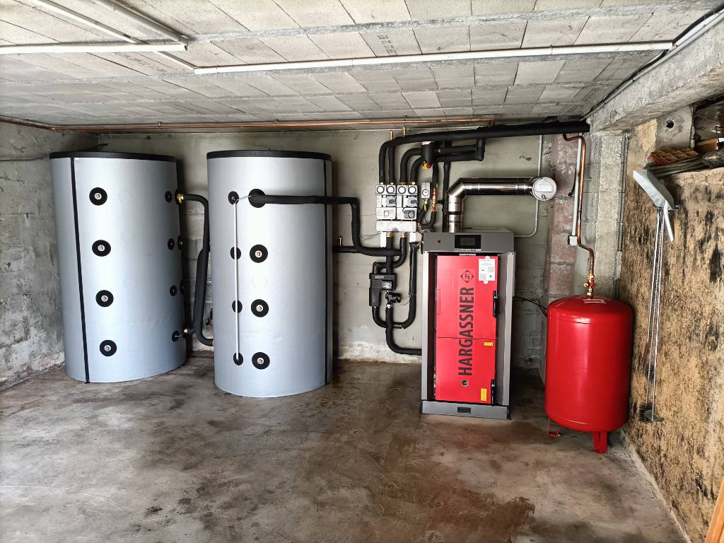 Remplacement d'une chaudière fioul par une chaudière à bois buches Hargassner SMART HV après un désembouage complet de l'installation. Les ballons tampons ont pris la place de la cuve fioul, la chaudière reste au même endroit. Le stockage d'énergie réalisé avec 2 ballons de 800L permet un seul chargement par jour en plein hiver.